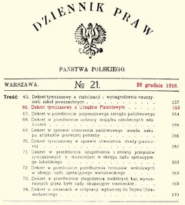 Jedną z pierwszych decyzji nowych władz, było utworzenie 28 grudnia 1918 r. Urzędu Patentowego.